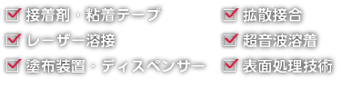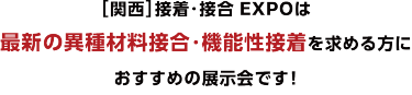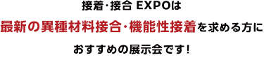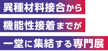 接着・接合 EXPO - Adhesion & Bonding Expo - は異種材料接合から一般用途まで、製造業で欠かせない接着・接合技術に特化した専門展です。エレクトロニクス、自動車、電池、建築・建材をはじめとした様々な業界から、接着・接合技術を求める専門家が来場します。