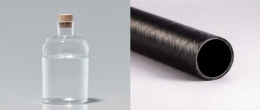 【写真】左:液状のポリカーボネートジオール「デュラノール™」右:炭素繊維強化ポリアミド樹脂 UDテープ(開発品)