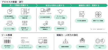 株式会社電通総研が展開するサービス「グリーンイノベーションコンパス」は、企業がGXに取り組む際のプロセスをコンサルティングするものです。GXは、経営企画やサステナビリティ関連の部門から声が挙がることがありますが、そうしたセクションが取り組みで困った際はもちろん、製造、開発といった現場の課題も拾い上げ、最適なプロセスを提案します。