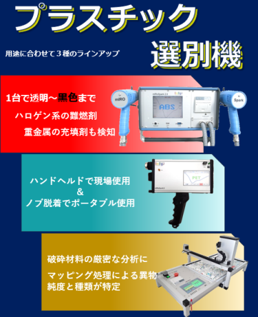 別のメーカーがつくる選別機も紹介します。フジトク株式会社は、近赤外線とスパーク放電によるプラスチック選別機を開発。色による選別ができる他、難燃剤や重金属添加物の検出もできるものです。