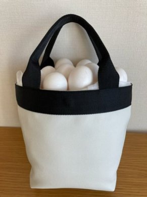 【写真】「エッグシェルレザー」(同社提供)※卵を入れているバッグの材料に採用。環境配慮型商品に貢献できないかと加工工場と一緒になって考えて製品化。合成皮革で使われている材料のひとつである炭酸カルシウムに着目。その炭酸カルシウムが主成分である卵の殻が焼却や埋め立て処分されていることを知り、エッグシェルレザーが生まれるキッカケとなった。