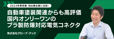 株式会社グローブ・テックは、最新の防爆対応電気コネクタ「DXNシリーズ」を展示する。国内の防爆規格および国際標準規格に適合し、IP66/67の防水・防塵性能を備えた製品である。これまで一部の顧客向けに紹介してきたが、本展示会の出展を機に積極的な営業提案を図る。本体がプラスチック製のため、従来の金属製に比べて軽量で扱いやすい点が特徴。特に、ボタン一つで簡単に脱着できる設計は、従来の金属製コネクタに比べ作業効率が大幅に向上する。また、従来品にはない中継接続に対応しており、工場内のレイアウト変更にも柔軟に対応できる点が大きなメリットである。