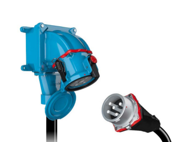 同社の防爆型コンセントDXNシリーズ。20A/32A/63Aの3タイプが有り、非常に軽量で扱いやすいと好評だ