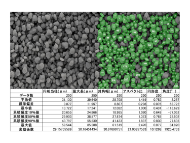 粉体観察において重なりや凝集粒子の1次粒子径をみたいときに画像データがあれば全自動解析が可能に。「教師データなし」で使える(同社提供)