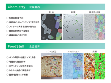 「GeXeL」は、化学業界や食品業界、医療・美容業界など、さまざまな分野で活用されている。化学業界では粉体の形状や粒子の大きさ、触媒の凝集具合などを正確に解析する事例があり、食品業界ではパンの空孔サイズや培養肉の細胞解析、医療・美容業界では細胞やコロニーの解析が行われている。AIを使うことで解析結果のばらつきが減り、一定の品質基準を維持できるようになっている。これにより、作業者の熟練度に依存せず、安定した製品品質の確保に貢献している。