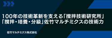 佐竹マルチミクス株式会社は、100年以上の歴史を持つ撹拌技術のリーディングカンパニー。主力製品である撹拌機だけでなく、蓄積した撹拌と流体解析技術を応用し、培養・分級分野へと新たな事業を展開している。同社の分級機は、主に半導体や電子部品の製造過程で活用され、特にフィラーの粒度調整や微細粒子の分級においてその強みを発揮する。