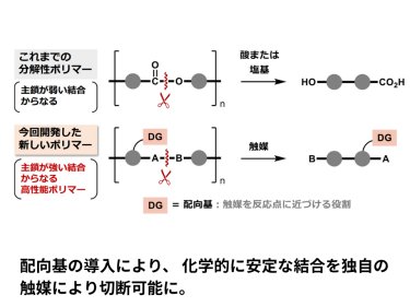 鳶巣教授が長年取り組んできたのは、有機化学の分野で医薬品などの原料となる低分子化合物を合成する研究。その中核となる技術が「強固な化学結合を切るための触媒開発」だった。ある時、環境問題として報道されるプラスチック汚染のニュースを見て、「自分たちの触媒が高分子にも応用できるのでは」とひらめいたという。実際、プラスチックの分解が難しいのは、主鎖の化学結合が非常に安定しているため。「それならその結合を狙って切れるように設計すればいい」と考え、研究が始まった。