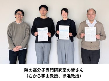 研究を始めて最初に立ちはだかったのが、ポリマーそのものを作るという壁だった。「我々は有機化学が専門で、高分子ポリマーを自作したことがなかった」と鳶巣教授。しかも今回必要となるのは、既存にはない「配向基付き」の新素材。合成法も分析手法もすべて手探りだった。同研究室で大学院生の小川敏史さんは、ポリマー合成の基礎から独学し、何度も試作を繰り返した。研究を大きく進展させるきっかけとなったのは、隣の高分子専門研究室(宇山教授、徐准教授)との連携で、ポリマーの合成・分析の手ほどきをしてもらった。「失敗の連続で、本当にこれ分解できるのかと不安ばかりでした」。それでも諦めず、触媒反応によって徐々に溶けていく瞬間に立ち会ったとき、「おっ、いってるじゃん」と手応えを感じたという。